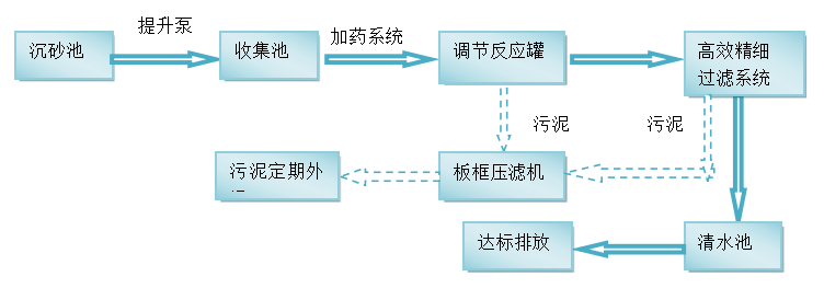 先通过化学破乳,去除浮油后再通过物理化学相结合及其最佳的配方组合与污水充分混合,依靠药剂的物理化学反应,使污水中溶解状态下的有机污染物、乳化油等析出,成为固相界面的微小颗粒,再通过混凝、絮凝药剂的物理化学吸附、架桥和压缩双电层等作用,将各类悬浮物颗粒凝聚成大而密实的絮团然后经过高效沉淀罐将油脂和悬浮颗粒去除,再通过高效精细过滤器系统精细过滤。