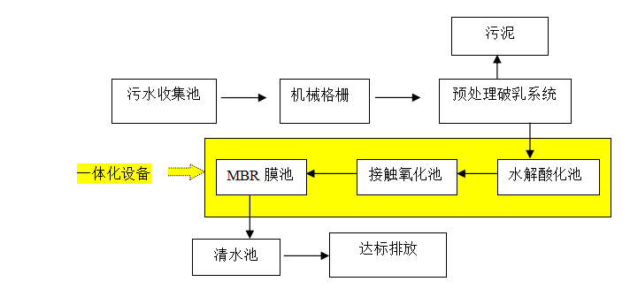 本着投资少,效益高,稳定高效的工艺路线,结合本项目实际的情况,由于本项目水量小,为减少土建施工成本,本项目采用一体化生化处理设备进行处理,一体化设备采用“物化破乳+水解酸化+接触氧化+MBR膜”的工艺,使得污水能稳定的达到排入污水管道的的水质标准。